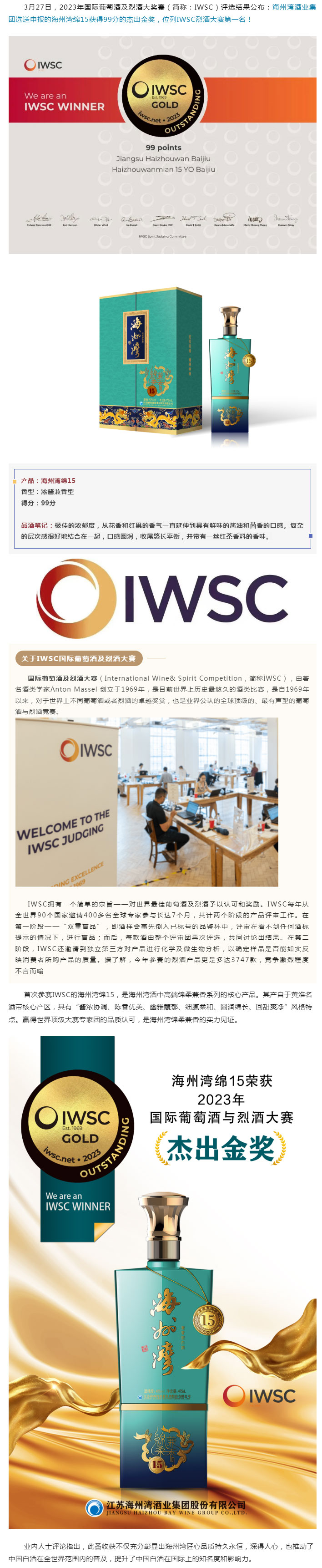 海州湾绵15获评IWSC国际烈酒大赛“杰出金奖”!